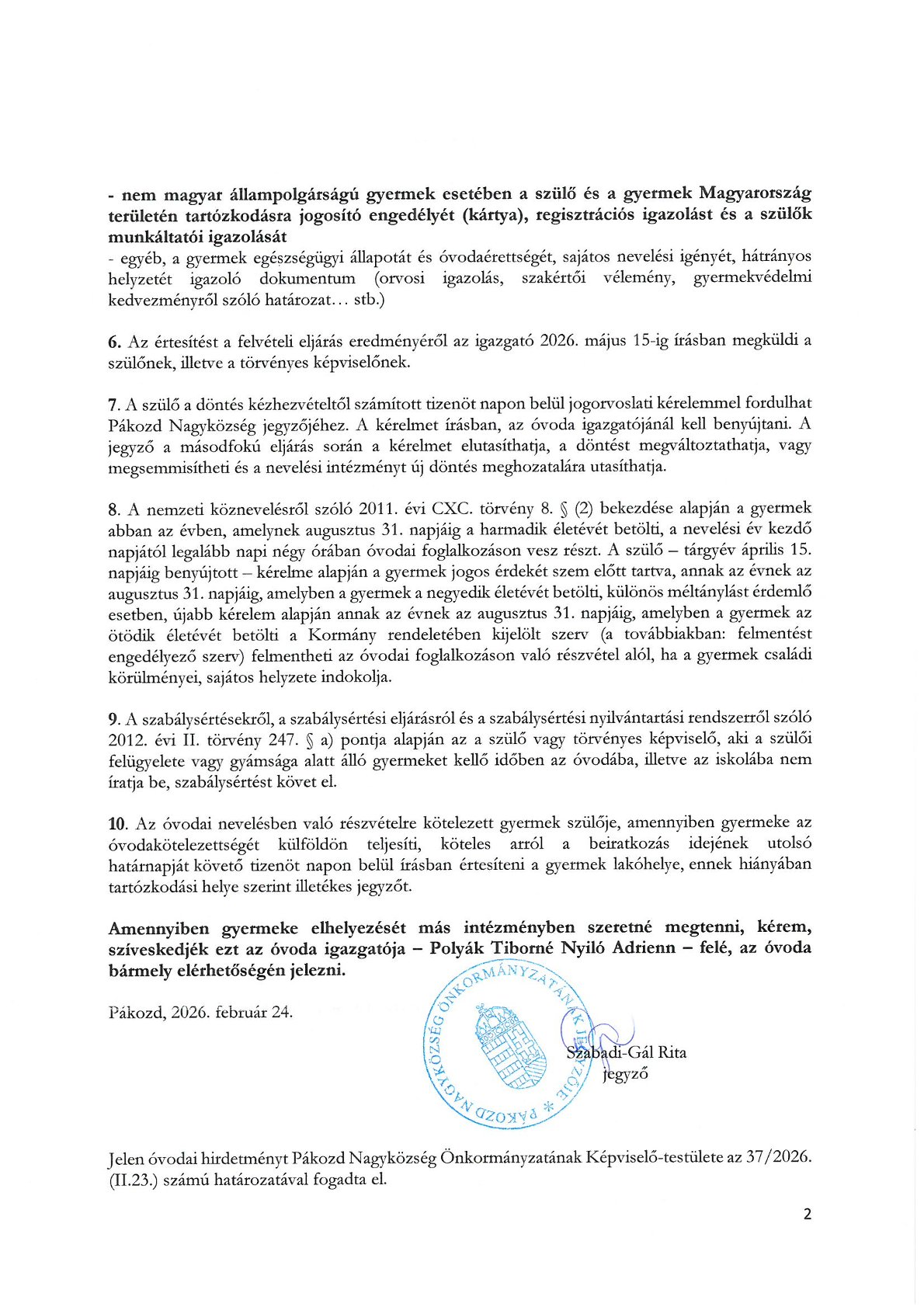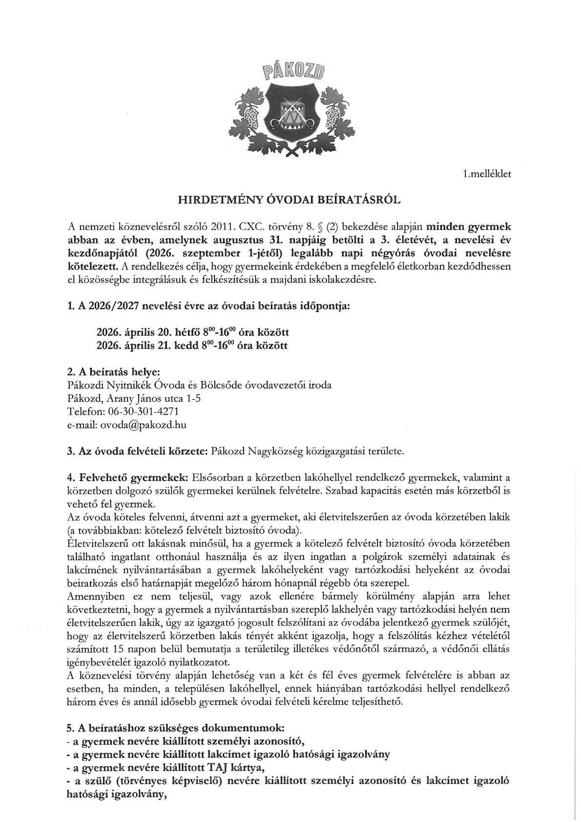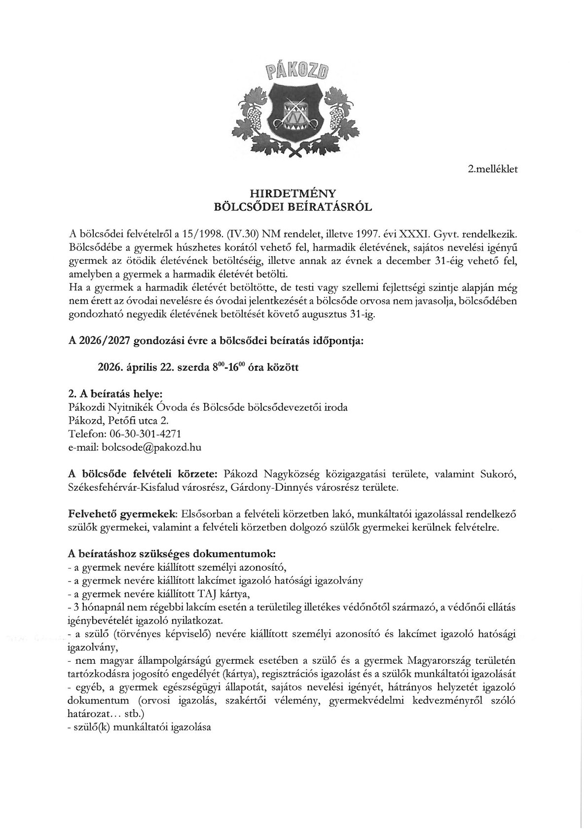 Hirdetmény a 2026/2027 gondozási évre történő bölcsődei beíratásról