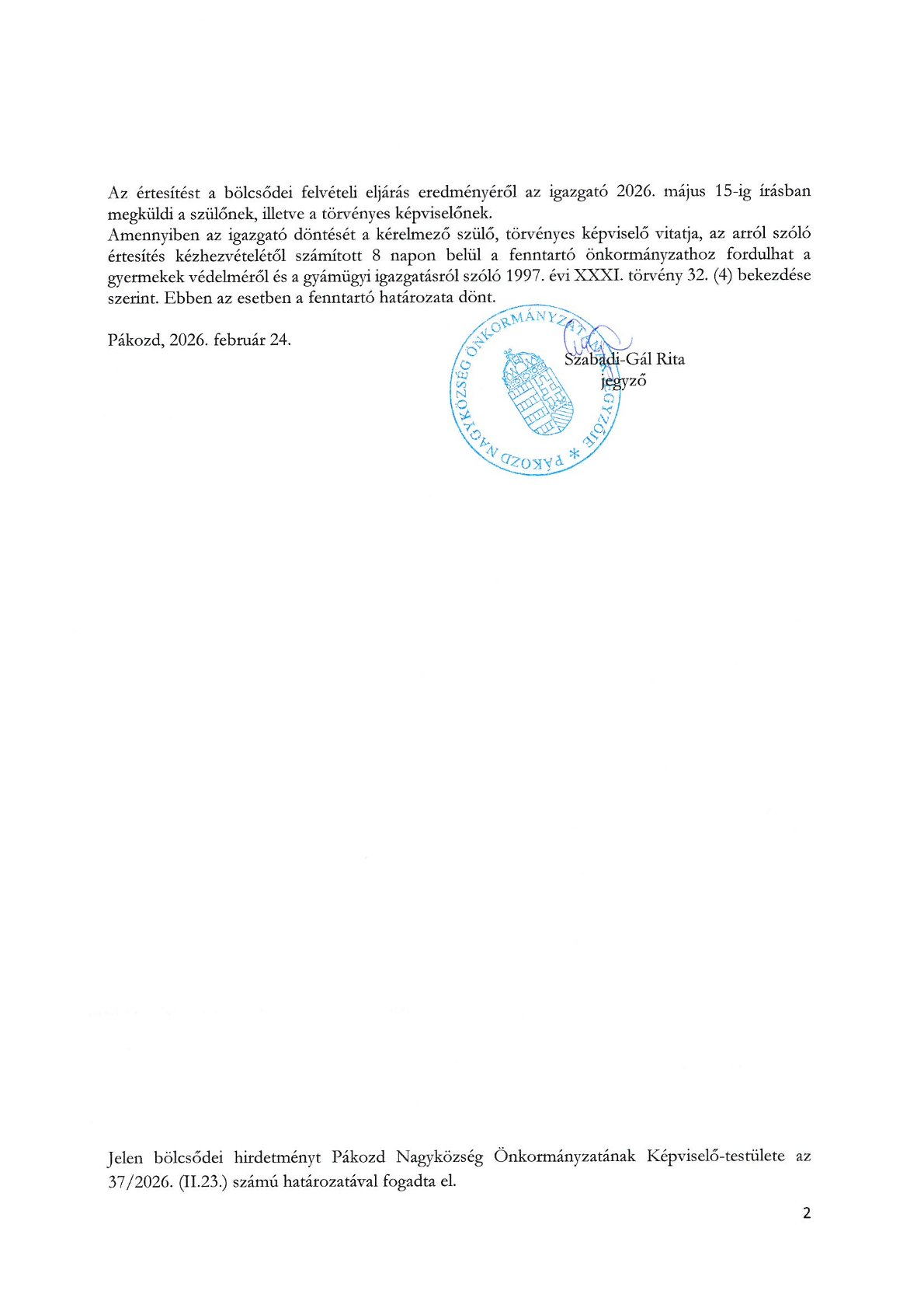 Hirdetmény a 2026/2027 gondozási évre történő bölcsődei beíratásról