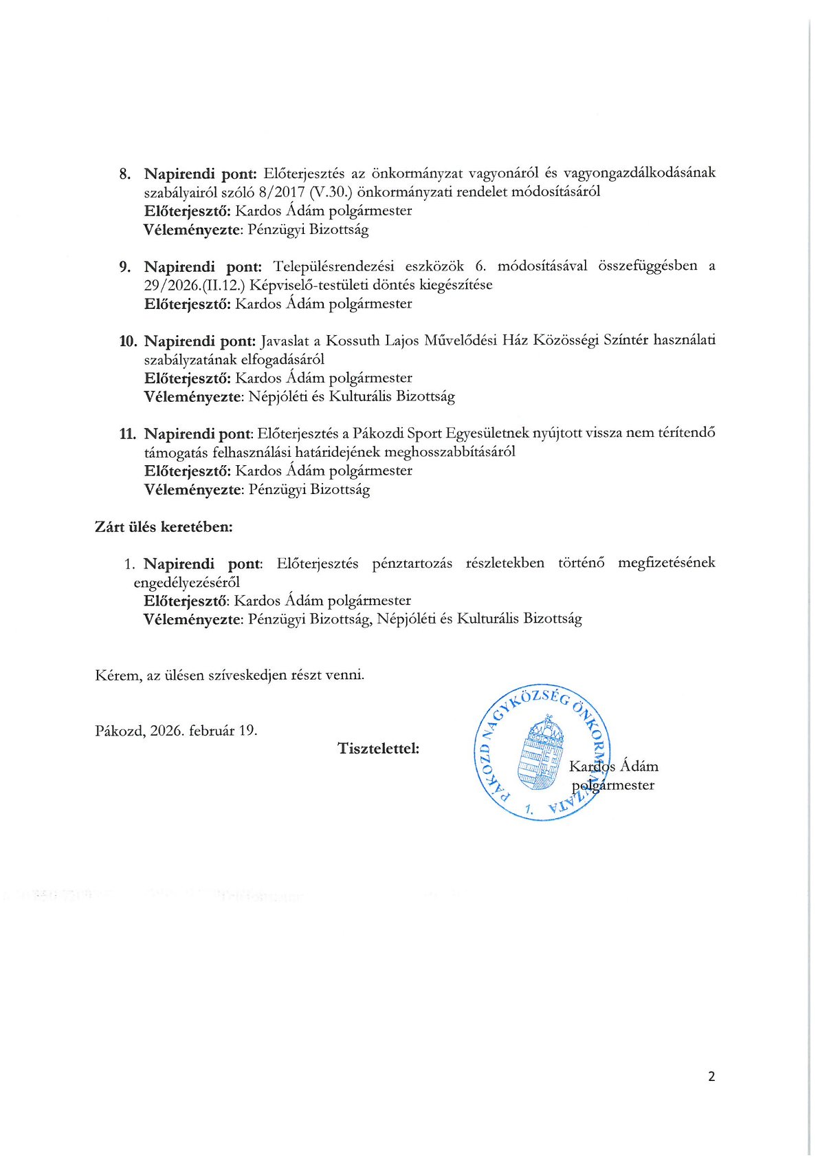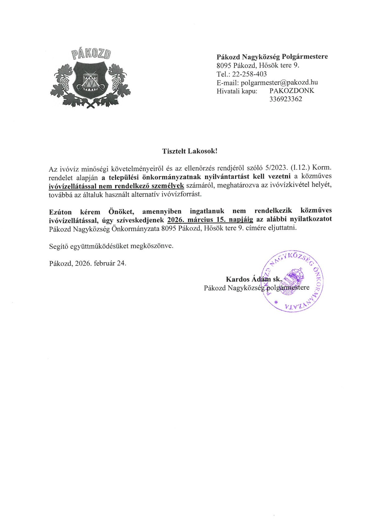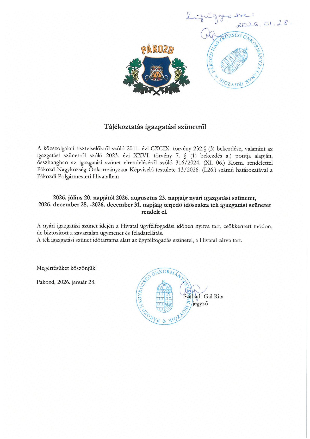 Tájékoztatom a Tisztelt lakosságot, hogy a Pákozdi Polgármesteri Hivatalban 2026. január 10 napján (szombaton) az ügyfélfogadás szünetel.