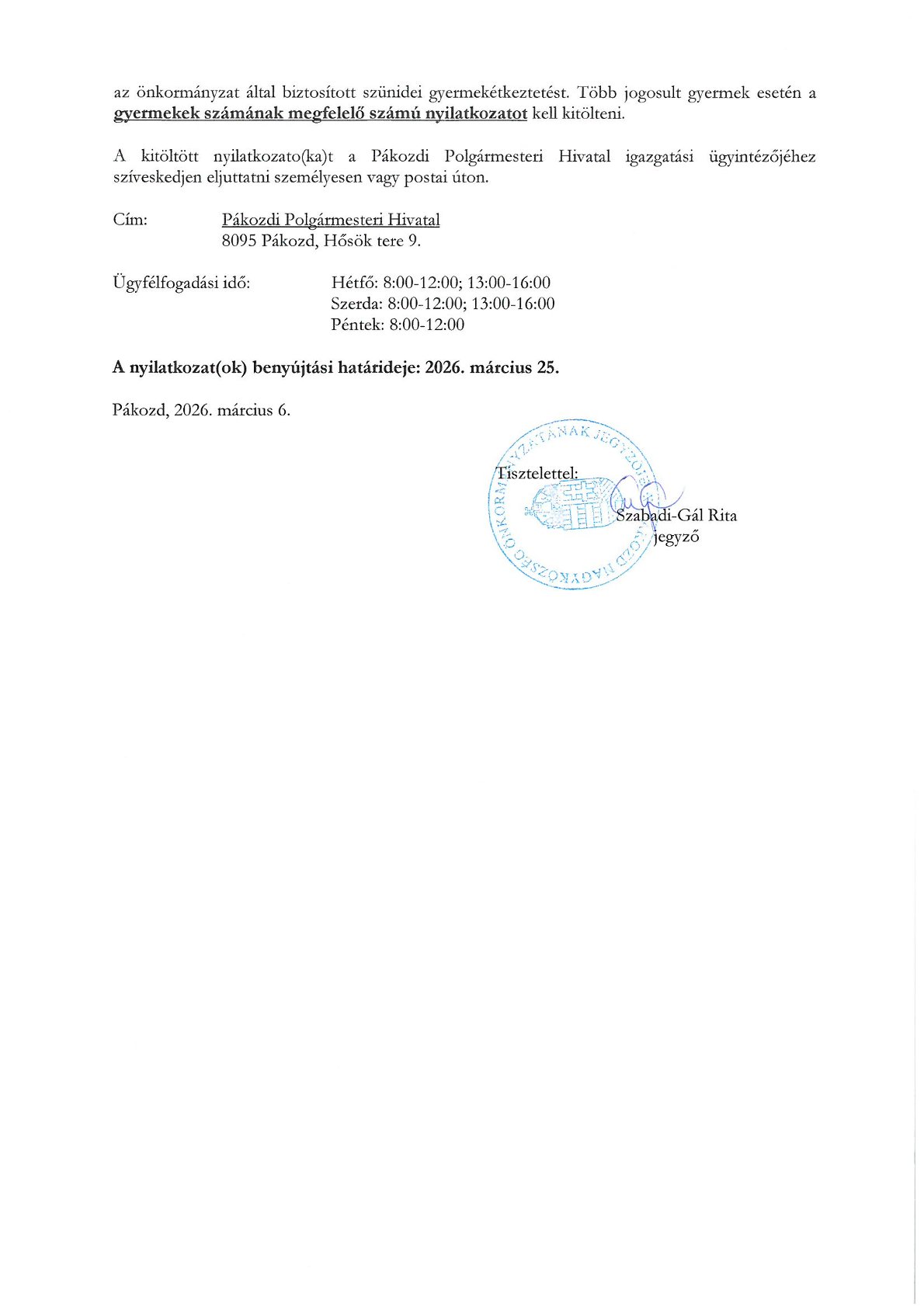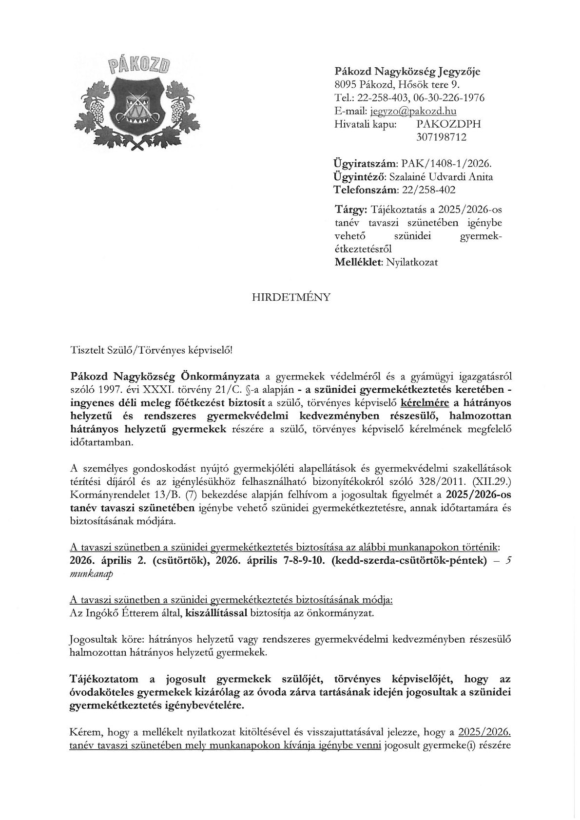 Tájékoztatás a 2025/2026-os tanév tavaszi szünetében igénybe vehető szünidei gyermekétkeztetésről: