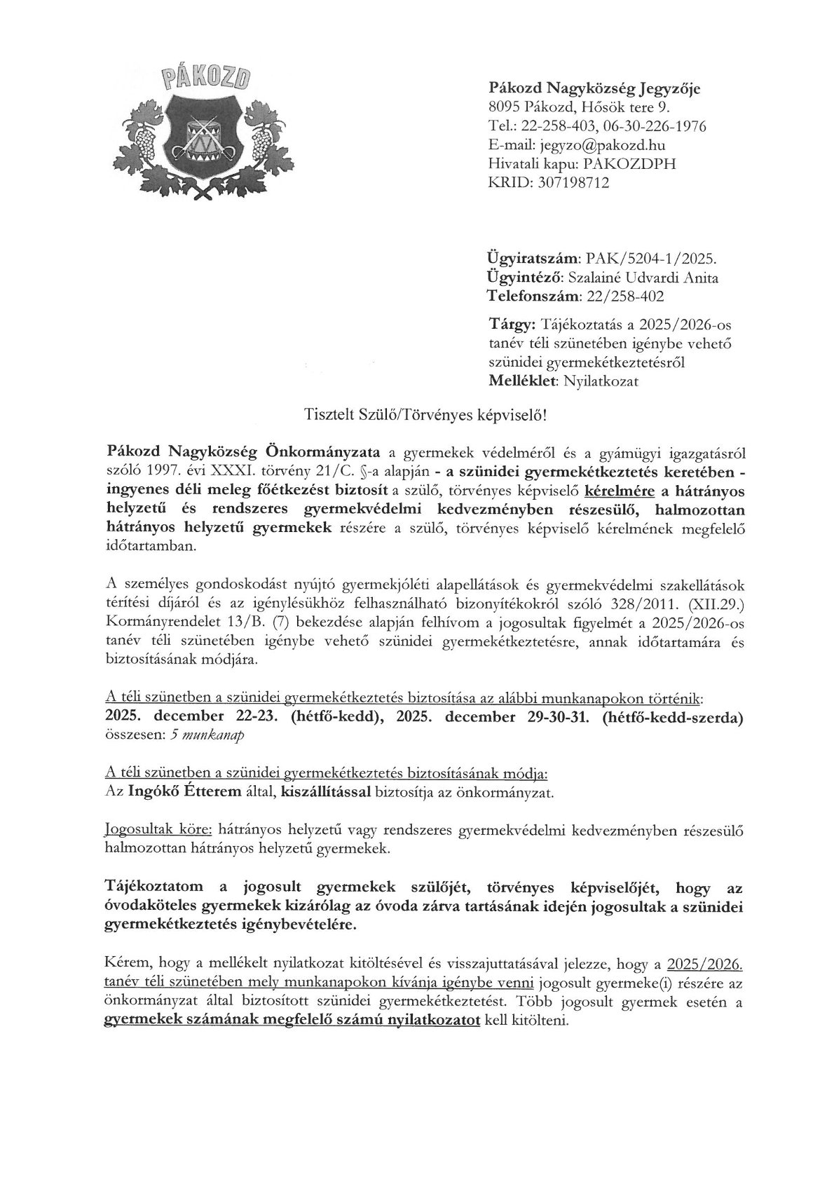 Tájékoztatás a 2025/2026-os tanév téli szünetében igénybe vehető szünidei gyermekétkeztetésről: