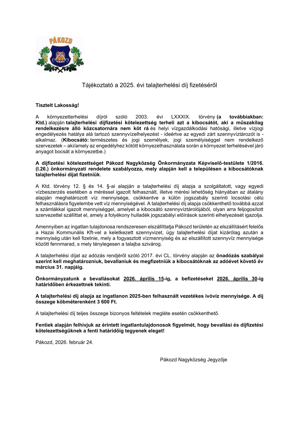 Tájékoztató a 2025. évi talajterhelési díj fizetéséről: